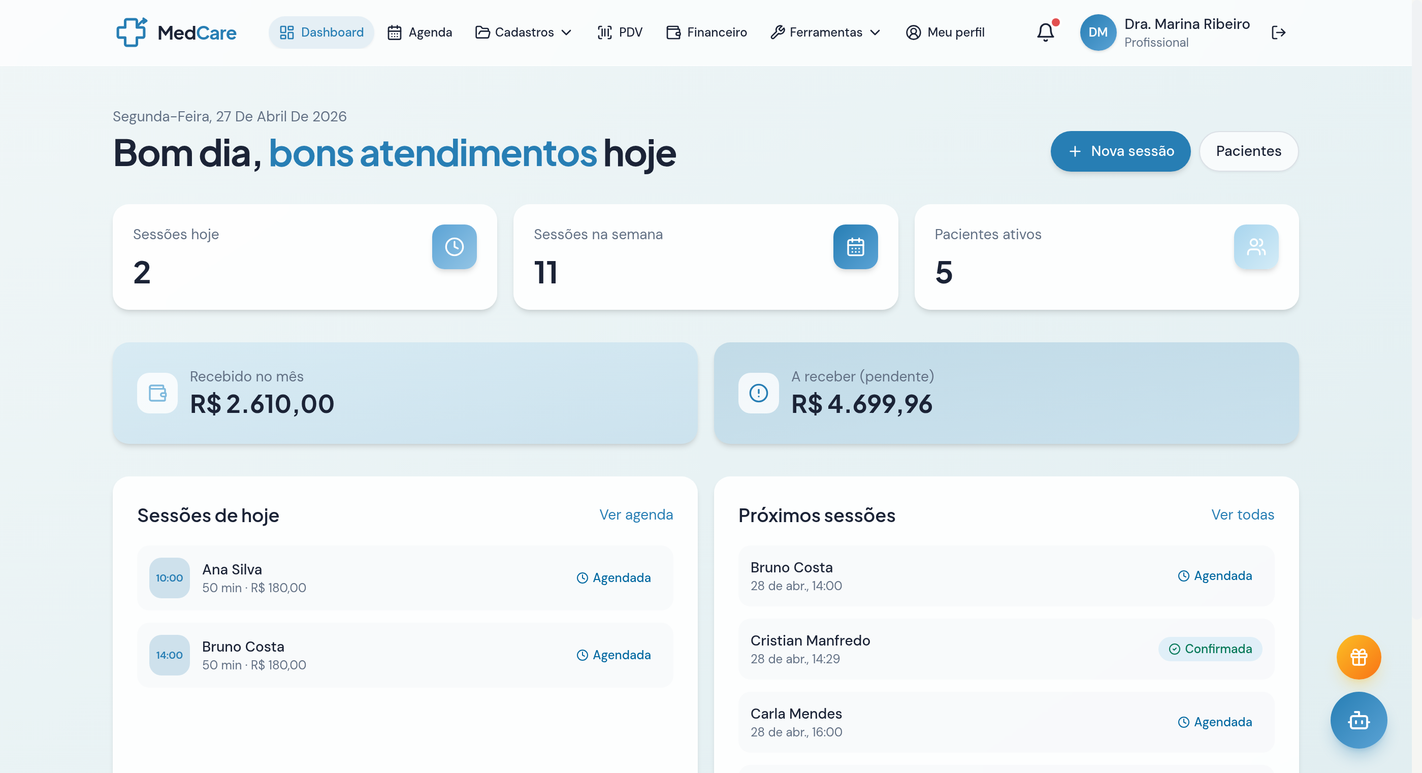 Receitas, despesas, relatórios de faturamento e controle completo do seu consultório.